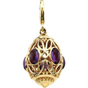 This magical egg-shaped pendant is set with beautiful amethyst cabochons. It looks like it could be worn by an Elvish queen, a Disney villain, or a Renaissance age duchess.
